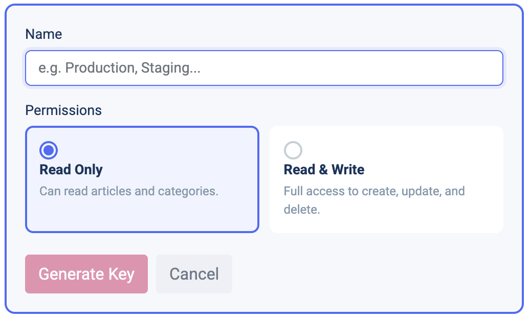 If you’re unsure which access level you need or have a specific use case in mind, start with a read-only key — you can always create additional keys later.